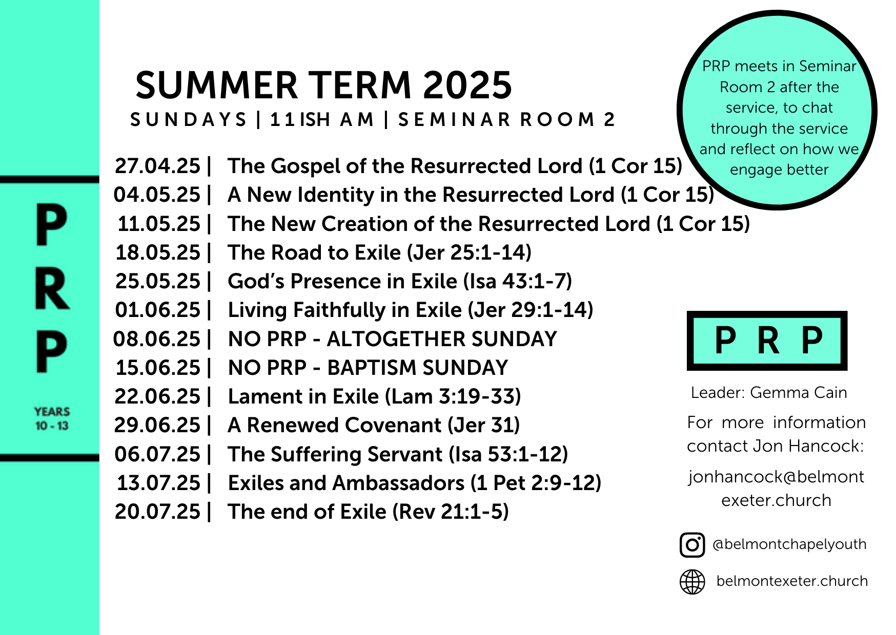 PRP meets on Sunday mornings. Come along to the 10am service and meet afterwards to chat through the talk, ask questions and pray together.