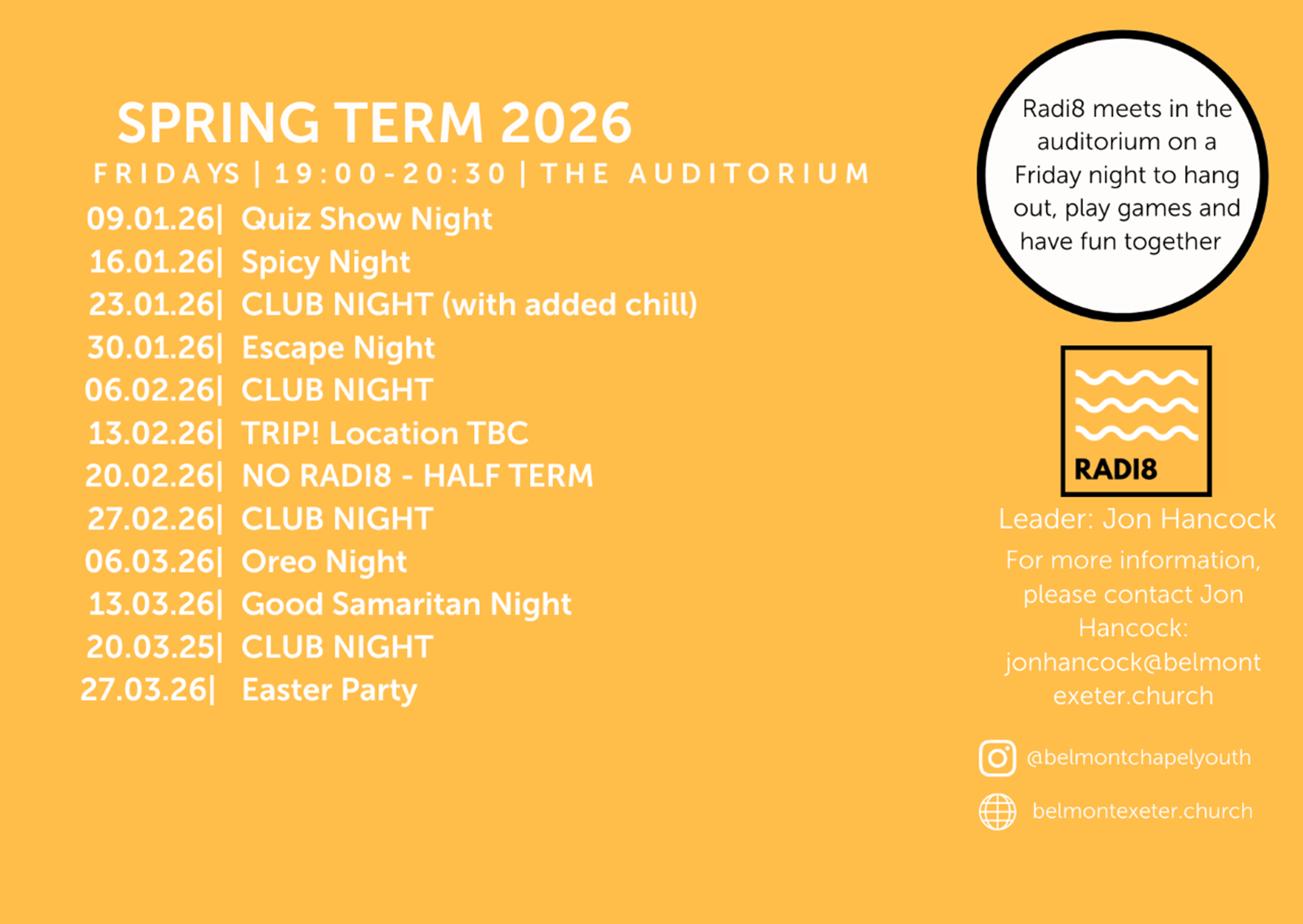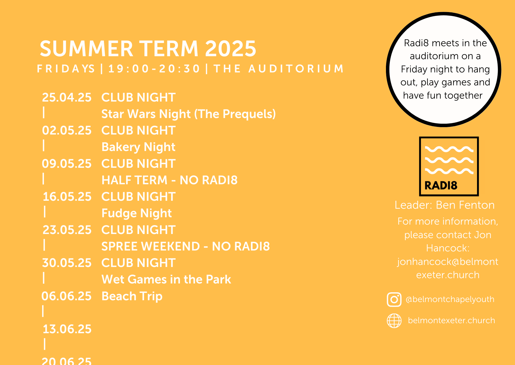 Radi8 meets on Friday evenings from 7.00 – 8.30pm in the Auditorium. Join us on Friday evenings to hang out, play games and have fun together.